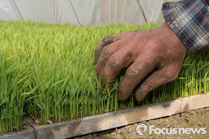 (파주=포커스뉴스) 25일 오전 경기도 파주시 오두산 인근 논밭에서 한 농부가 비닐하우스에 있는 벼들을 위해 공기를 환기시키고 있다.