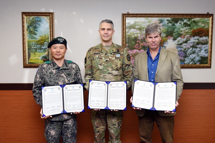 (서울=포커스뉴스) 한·미 전사자 유해 상호봉환 행사를 하루 앞둔 지난 27일 국방부 유해발굴감식단장 이학기(왼쪽부터) 대령, 유엔사 군정위 비서장 미닉 대령, 미국 DPAA 감식소장 버드 박사가 유해 인수인계서에 서명을 마치고 기념사진을 촬영하고 있다. <사진제공=국방부 유해발굴감식단>