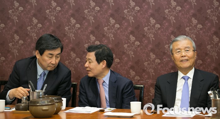 (광주=포커스뉴스) 이종걸(왼쪽) 더불어민주당 원내대표와 윤장현(가운데) 광주시장이 25일 오후 광주의 한 음식점에서 열린 당지도부·출마자·단체장 오찬 간담회에 참석해 대화하고 있다. 오른쪽은 김종인 비대위 대표.