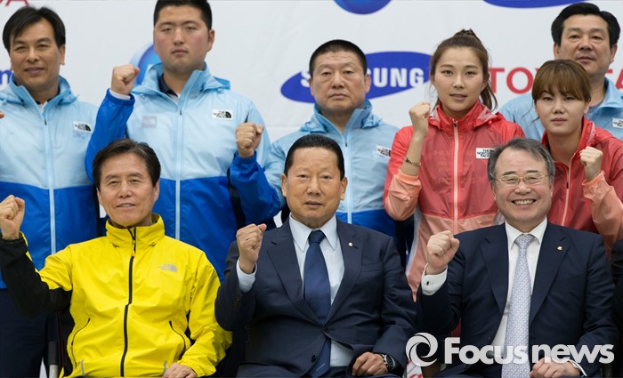 (서울=포커스뉴스) 27일 오후 서울 노원구 태릉선수촌에서 제31회 리우하계올림픽대회 D-100일 미디어데이에 참석한 대한체육회장과 선수단장, 선수들이 파이팅을 외치며 기념촬영을 하고 있다. 첫째줄 오른쪽부터 강영중 대한체육회장, 김정행 대한체육회장, 최종삼 태릉선수촌장.