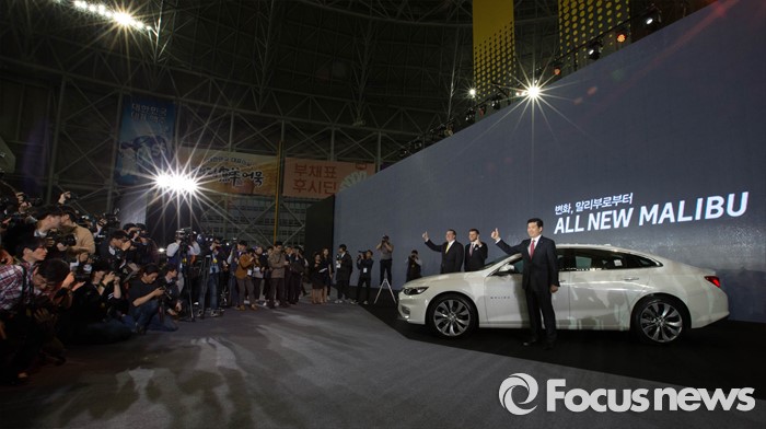 (서울=포커스뉴스) 27일 오전 서울 구로구 고척스카이돔에서 열린 한국지엠 '올 뉴 말리부' 신차 발표회에서 제임스 김(오른쪽) 한국지엠 사장과 쉐보레 관계자들이 신차 발표를 축하하며 취재진을 향해 포즈를 취하고 있다.