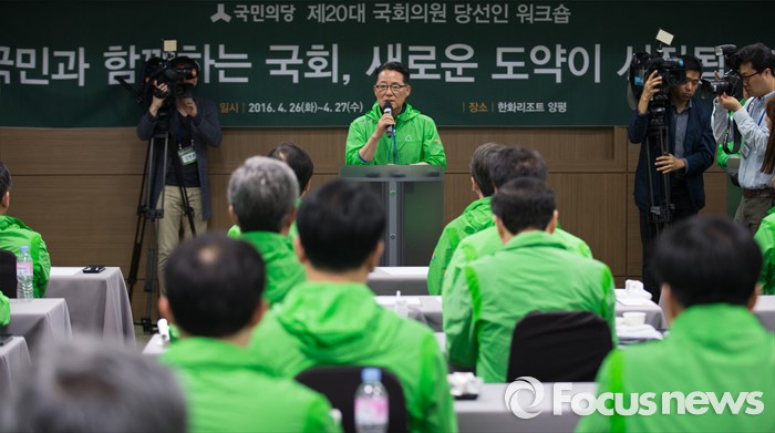 (양평=포커스뉴스) 국민의당 20대 총선 당선인 워크숍에서 합의 추대된 박지원 신임 원내대표가 27일 오전 경기도 양평 한화리조트에서 인사말을 하고 있다.