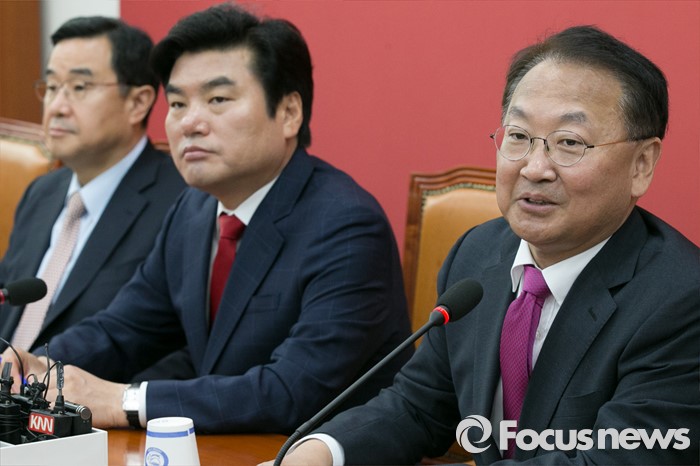 (서울=포커스뉴스) 유일호(오른쪽) 경제부총리 겸 기획재정부 장관이 29일 오전 서울 여의도 국회 새누리당 원내대표실을 방문해, 인사말을 하고 있다. 이날 유 부총리는 여야 3당 원내지도부를 면담하고, 경제활성화법 등 쟁점법안 처리를 촉구했다.