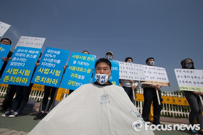 (서울=포커스뉴스) 26일 오전 서울 영등포구 국회의사당 앞에서 사법시험 준비 고시생 이종배씨가 사법시범 존치를 촉구하며 삭발을 하고 있다.