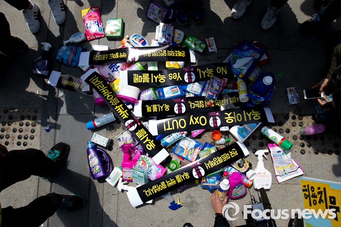 (서울=포커스뉴스) 25일 오전 서울 종로구 광화문 광장에서 옥시 가습기 살균제 피해 가족 및 환경단체 관계자들이 옥시 상품 불매를 촉구하는 퍼포먼스를 펼치고 있다.