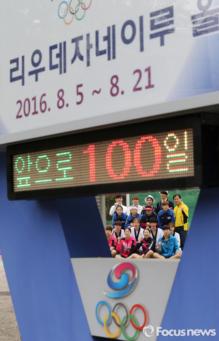 (서울=포커스뉴스) 2016년 브라질 리우데자네이루 하계올림픽 개막을 100일 앞둔 27일 오후 서울 노원구 태릉선수촌에서 최종삼 선수촌장과 각 종목 국가대표 선수들이 파이팅을 외치고 있다.