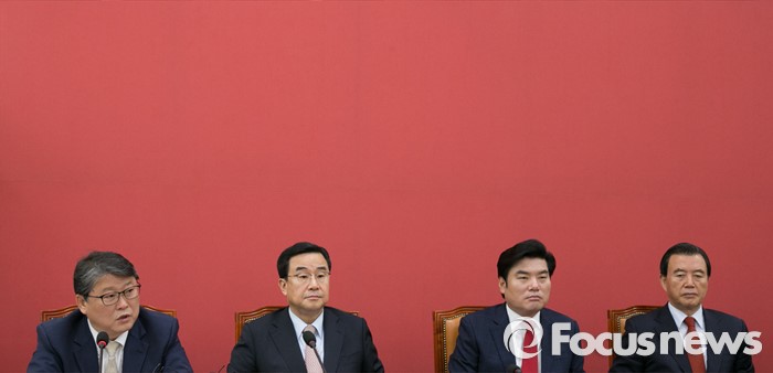 (서울=포커스뉴스) 29일 오전 서울 여의도 국회에서 새누리당 원내대책회의가 열리고 있다. 왼쪽부터 조원진 원내수석부대표, 김정훈 정책위의장, 원유철 대표최고위원 권한대행, 홍문표 제1사무부총장.