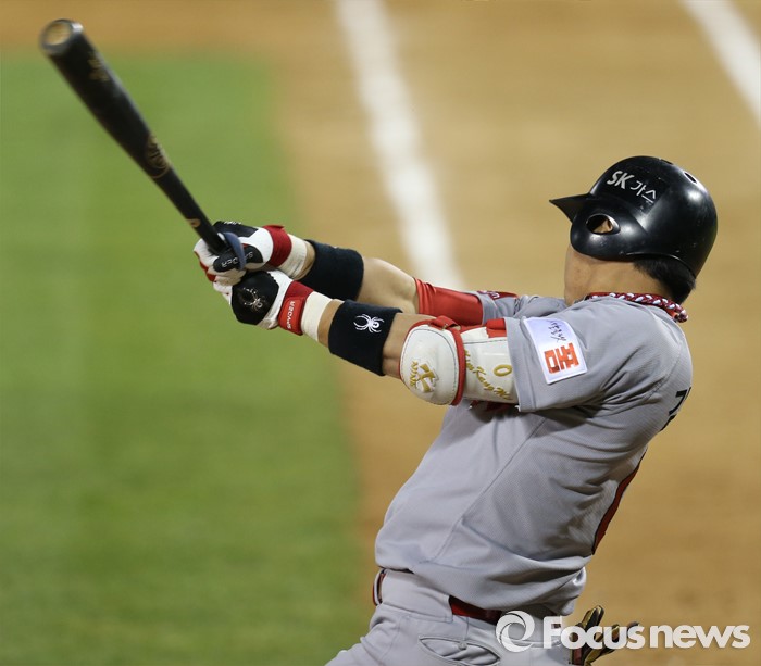 (서울=포커스뉴스) 27일 서울 잠실구장에서 열린 2016 프로야구 SK-두산 경기 5회초 SK 선두타자 김강민이 좌월 솔로 홈런을 치고 있다.
