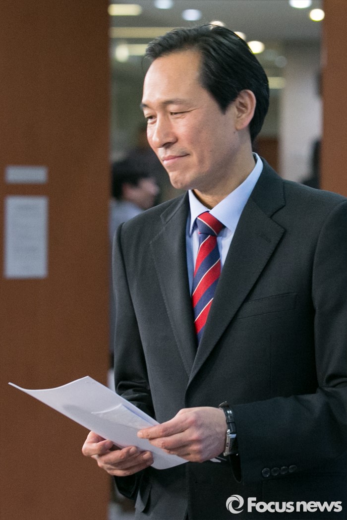(서울=포커스뉴스) 우상호 더불어민주당 의원이 29일 오후 서울 여의도 국회 정론관에서 당 원내대표 출마 기자회견을 위해 입장하고 있다.