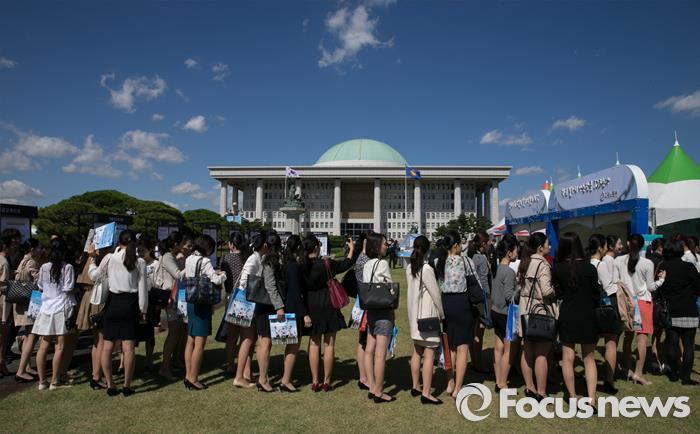 정부는 근로자를 위한 기업기여금(300만원)에 대해서는 손금인정, 세액공제 등 지원하고 정규직 전환지원금 390만원도 지급하기로 했다.(서울=포커스뉴스) 지난해 10월2일 오전 서울 여의도 국회 잔디마당에서 열린 대한민국 청년 20만+ 창조 일자리 박람회를 찾은 여학생들이 대한항공 부스에서 순서를 기다리고 있다. 2015.10.02 박동욱 기자