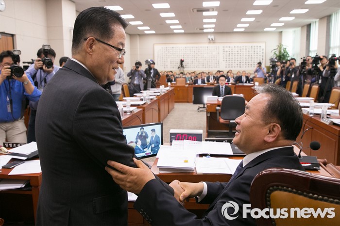 (서울=포커스뉴스) 이상민(오른쪽) 법사위원장과 박지원 국민의당 원내대표가 28일 오후 서울 여의도 국회 법제사법위원회 전체회의장에서 악수하고 있다.