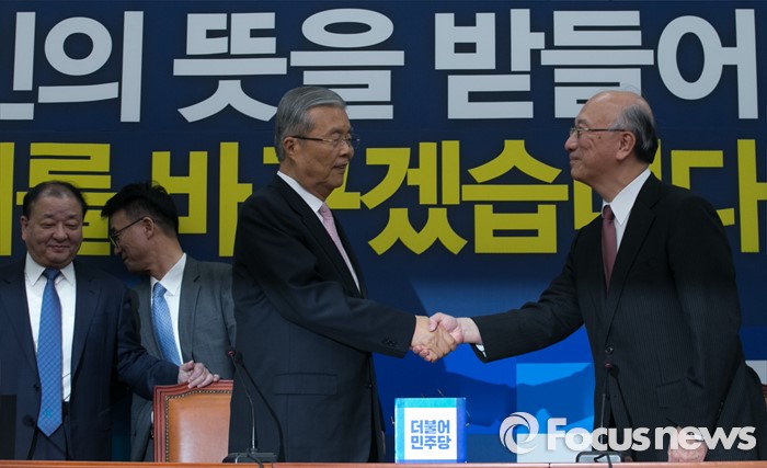 (서울=포커스뉴스) 김종인(왼쪽 세번째) 더불어민주당 비대위 대표가 26일 오후 서울 여의도 국회를 방문한 벳쇼 코로(오른쪽 첫번째) 주한일본대사와 만나 환담에 앞서 악수하고 있다.
