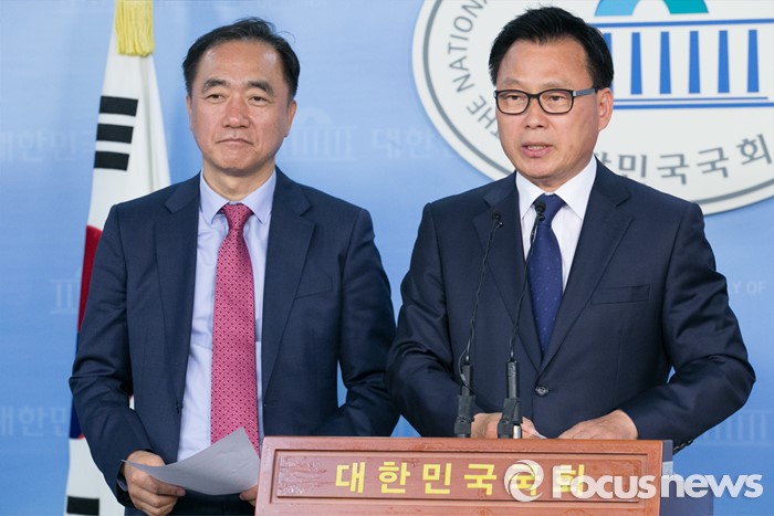 (서울=포커스뉴스) 정장선(왼쪽) 더불어민주당 총무본부장과 박광온 대변인이 27일 오전 서울 여의도 국회 정론관에서 전당대회 일정 등과 관련 브리핑을 하고 있다.
