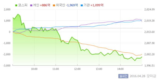 이날 코스피는 전일 대비 0.27% 오른 2020.83에 장을 시작했지만 이후 하락 곡선을 보였다. 장 막판에는 2000선 밑으로 떨어지기도 했다.