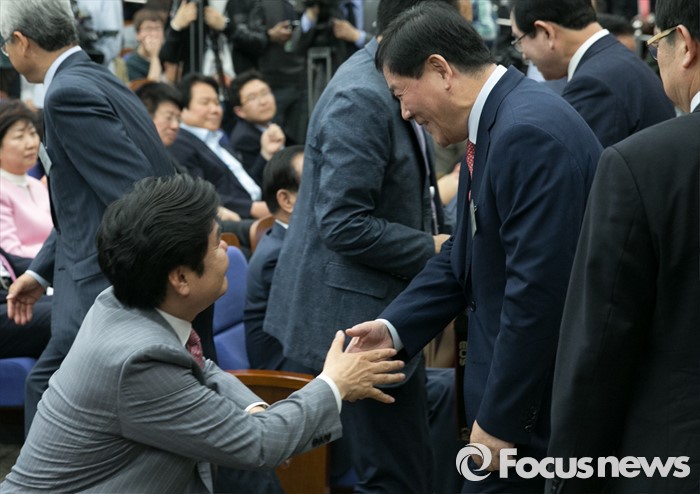 | △ 악수하는 원유철-최경환 |