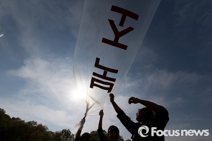 (파주=포커스뉴스) 29일 오후 경기 파주 낙하IC 인근에서 탈북자단체인 자유북한운동연합이 북한에 핵과 미사일을 포기하고 국제사회 일원으로 참여할 것을 촉구하는 내용의 대북전단을 날려보내기 위해 수소가스를 주입하고 있다.