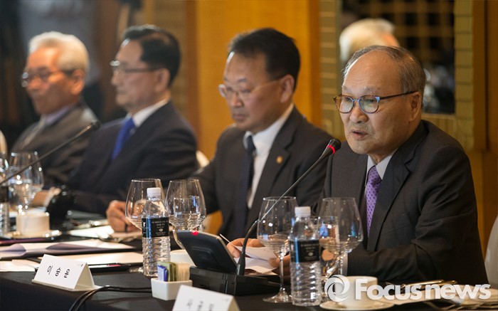 (서울=포커스뉴스) 이승윤 전 경제부총리가 28일 오후 서울 서초구 JW메리어트호텔에서 열린 역대 부총리 및 장관과의 만찬 간담회에서 모두발언 하고 있다.
