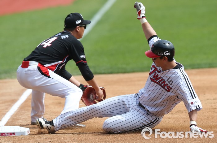 (서울=포커스뉴스) 1일 서울 잠실구장에서 열린 2016 프로야구 kt-LG 경기 1회말 무사 1,2루에서 LG 채은성의 중견수 플라이 아웃때 2루주자 박용택이 3루로 뛰어 세이프되고 있다.