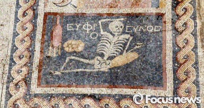 모자이크는 바닥에 기댄 자세를 취한 해골과 빵 몇 덩어리로 꾸며져 있었다. 그 옆에 고대 그리스어가 적혀 있었는데, 이 글자를 고고학자들이 해석해냈다.