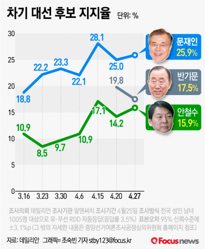 데일리안이 여론조사전문기관 알앤써치(R&Search)에 의뢰해 27일 발표한 여론조사 결과에 따르면 문 전 대표가 지지율 25.9%로 반 총장(17.5%)을 8.4%p 앞섰다.
