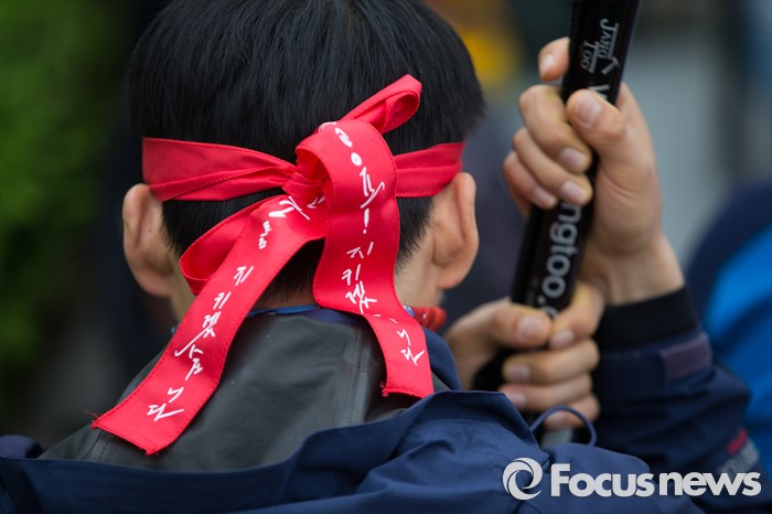 (서울=포커스뉴스) 27일 오후 서울 종로구 정부종합청사 앞에서 전교조(전국교직원노동조합)와 민주교육과 전교조 지키기 전국행동의 주최로 법외노조 후속조치 규탄 및 부당해고 저지, 노동기본권 쟁취를 위한 집회가 열리고 있다.