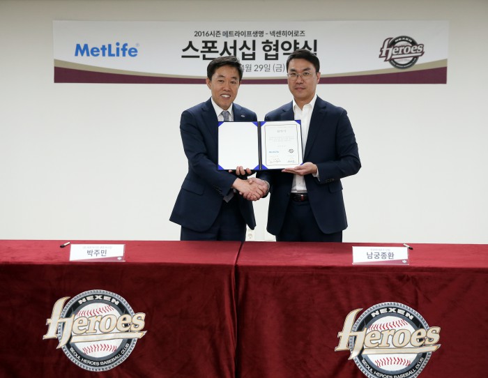 넥센은 올시즌 선수단 유니폼 어깨패치, 본부석 LED, 외야 대형보드 및 상단보드 등에 광고물을 부착한다. 메트라이프생명은 2013년부터 4년째 넥센과 골드스폰서십 계약을 이어가고 있다.프로야구 넥센이 메트라이프 생명과 골드스폰서십 계약을 맺었다. 넥센구단 남궁종환 단장(오른쪽)과 박주민 메트라이프생명 부사장이 협약 뒤 기념촬영을 하고 있다. <사진제공=넥센 히어로즈>