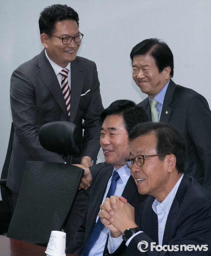 (서울=포커스뉴스) 29일 오전 서울 여의도 국회 의원회관에서 전당대회 연기론 등 논의를 위해 진행된 더불어민주당 4선 이상 중진모임에 참석한 송영길(뒤 왼쪽) 당선인과 박병석(뒤 오른쪽) 의원이 인사하고 있다.