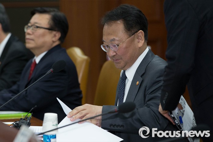 (서울=포커스뉴스) 28일 오후 서울 종로구 정부서울청사에서 열린 '경제관계장관회의'에 참석한 유일호 기획재정부 장관 겸 경제부총리가 회의를 준비하고 있다.