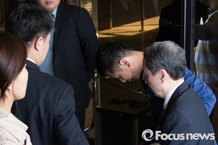 (서울=포커스뉴스) 가습기 살균제 과실 책임을 받고 있는 신현우 전 옥시 대표가 피의자 신분으로 26일 오전 서울 서초구 서울중앙지방검찰청에 출두하고 있다.