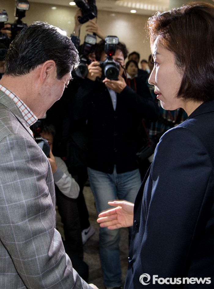 (서울=포커스뉴스) 새누리당 차기 원내대표 경선 후보등록 마감 예정일인 1일 오전 서울 여의도 국회 정론관 앞에서 차기 원내대표 후보군으로 거론되는 유기준(왼쪽), 나경원 의원이 대화하고 있다.