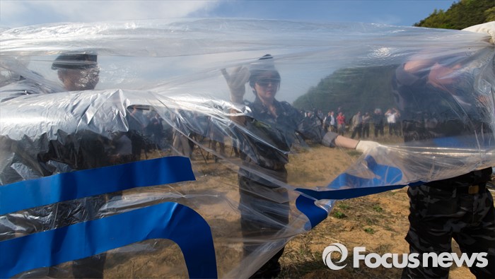 (파주=포커스뉴스) 29일 오후 경기 파주 낙하IC 인근에서 탈북자단체인 자유북한운동연합이 북한에 핵과 미사일을 포기하고 국제사회 일원으로 참여할 것을 촉구하는 내용의 대북전단을 날려보내기 위해 수소가스를 주입하고 있다.