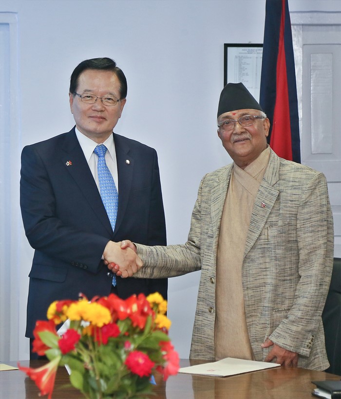 (서울=포커스뉴스) 정의화(왼쪽) 국회의장이 25일 오전(현지시각) 네팔 정부청사에서 울리(Khadga Prasad Sharma Oli) 총리와 면담에 앞서 기념촬영을 하고 있다. 정 의장은 이날 면담에서 북한 핵실험과 관련해 네팔 정부가 신속한 규탄성명을 발조한데 대해 사의를 표했다. <사진제공=국회>