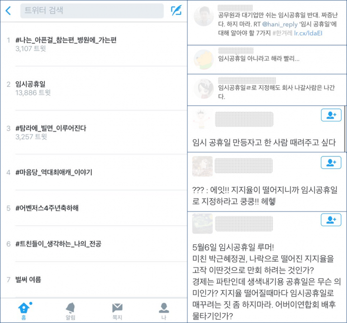 비정규직·시간제 근로자·서비스직 노동자·일부 자영업자들 중에는 임시공휴일로 지정되지 않았으면 하는 내용의 SNS 글을 쓰는 경우도 많았다. 4월26일 오후 3시 30분 기준, 트위터의 '임시공휴일' 해시태그로 작성된 글은 총 13,886개에 달하며 그 수는 계속 늘어가고 있다. 그 중 상당수가 임시공휴일 지정에 대한 부정적인 반응을 보이는 글이었다.