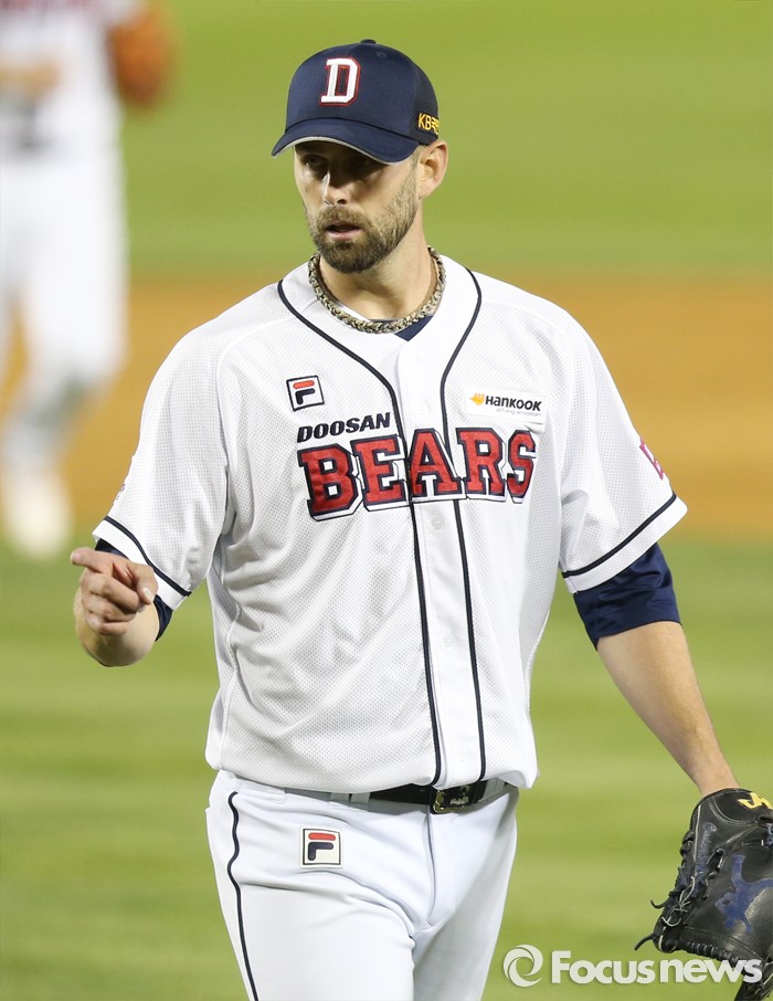 (서울=포커스뉴스) 26일 서울 잠실구장에서 열린 2016 프로야구 SK-두산 경기 5회초 2사 만루에서 두산 선발 니퍼트가 SK 최정민을 삼진으로 잡아 실점 위기를 넘기고 마운드를 내려오며 포수 양의지에게 격려의 사인을 보내고 있다.