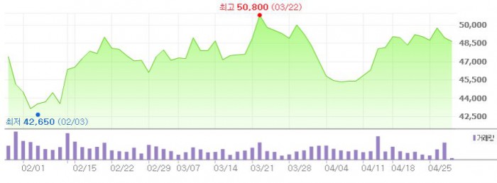 그는 그러면서 "실적 호조세는 2분기에도 이어질 전망"이라며 "양호한 신차효과를 기반으로 판매 대수가 65만대를 기록해 사상 최대를 기록할 것"이라고 관측했다.최근 3개월간 기아차 주가 추이 <그래픽출처=네이버>