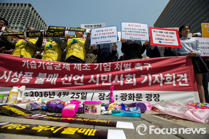 (서울=포커스뉴스) 25일 오전 서울 종로구 광화문 광장에서 옥시 가습기 살균제 피해 가족 및 환경단체 관계자들이 옥시 상품 불매를 촉구하는 기자회견을 하고 있다.