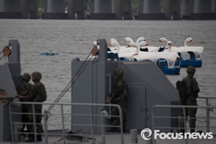 (서울=포커스뉴스) 27일 오전 서울 영등포구 여의도 한강공원 원효대교 일대에서 열린 '수도 서울 민․관․군 합동 대규모 복합재난 가상훈련'에 참가한 군인들이 경계를 서고 있다.