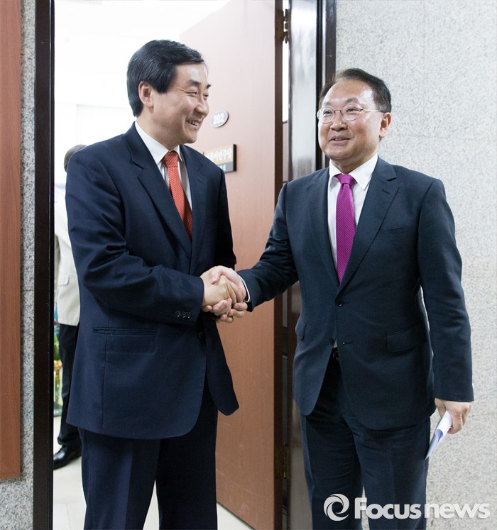 (서울=포커스뉴스) 이종걸(왼쪽) 더불어민주당 원내대표가 29일 오전 서울 여의도 국회에서 경제활성화법안 등 처리 요청을 위해 방문한 유일호 경제부총리 겸 기획재정부 장관과 면담을 마치고 마중하고 있다.