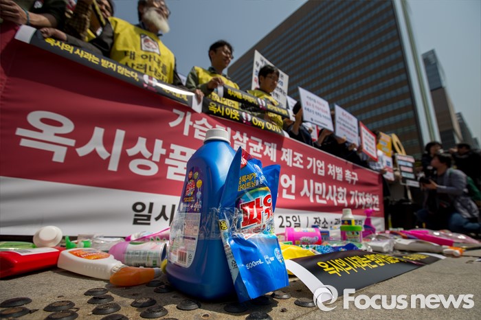 (서울=포커스뉴스) 25일 오전 서울 종로구 광화문 광장에서 옥시 가습기 살균제 피해 가족 및 환경단체 관계자들이 옥시 상품 불매를 촉구하는 기자회견을 하고 있다.