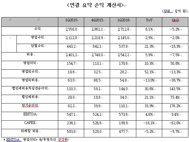 (서울=포커스뉴스) LG유플러스가 올해 1분기 마케팅 비용 절감에 힘입어 양호한 실적을 기록했다. LG유플러스는 27일 전년 동기 대비 10.3% 개선된 1706억 원의 영업이익을 올렸다고 공시했다. 마케팅 비용은 갤럭시S7·G5 등 신제품 출시에도 전년 동기보다 5.2% 줄어든 4777억원을 기록했다. 전 분기 대비해서도 9.7%가량 내렸다.