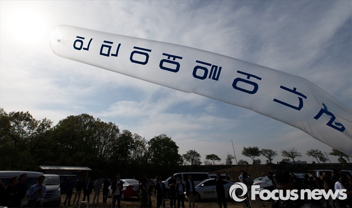 (파주=포커스뉴스) 29일 오후 경기 파주 낙하IC 인근에서 탈북자단체인 자유북한운동연합이 북한에 핵과 미사일을 포기하고 국제사회 일원으로 참여할 것을 촉구하는 내용의 대북전단을 날려보내고 있다.