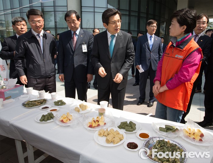(세종=포커스뉴스) 황교안 국무총리가 26일 오전 세종시 정부세종청사 국토교통부 내 광장에서 열린 국무총리실과 1사 1촌 자매결연을 맺은 충주 재오개마을 농·특산물 직거래 장터에 방문해 농산물에 대해 주민과 대화하고 있다.