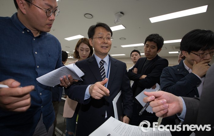 (세종=포커스뉴스) 이진석 교육부 학술장학지원관 2일 오전 세종시 정부세종청사 교육부 브리핑룸에서 법학전문대학원 입학실태조사 결과 발표를 마치고 취재진의 질문에 답변하고 있다.