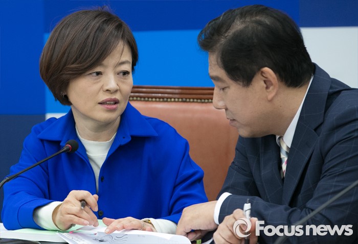 (서울=포커스뉴스) 29일 오전 서울 여의도 국회에서 열린 더불어민주당 보수단체 불법자금지원 의혹규명 진상조사 태스크포스(TF) 1차 회의에 참석한 진선미(왼쪽) 의원과 김병기 당선인이 대화하고 있다.