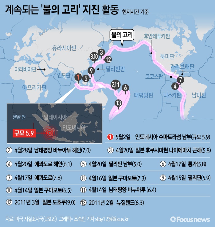 수마트라 섬은 2012년에도 규모 8.6 지진이 일어나 태국 남쪽에까지 광범위한 쓰나미 피해가 발생한 지진 다발 지역이다.2일(현지시간) 인도네시아 수마트라섬 남부에서 오전 4시21분쯤 규모 5.9 지진이 발생했다고 미국 지질조사국(USGS)가 밝혔다. 2016.05.02 조숙빈 기자