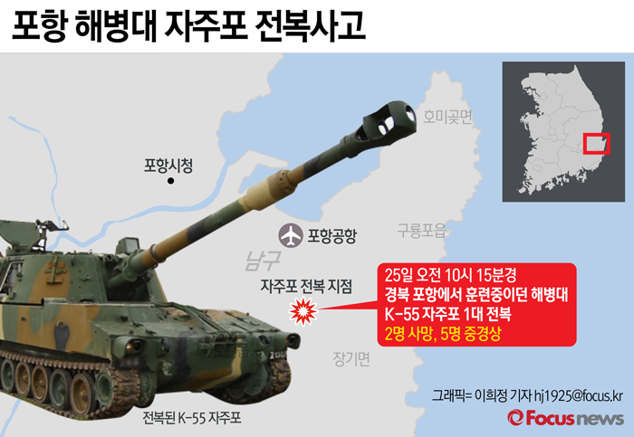(서울=포커스뉴스) 해병대 관계자에 따르면 25일 오전 10시 15분경 경북 포항에서 훈련중이던 해병대 소속 K-55 자주포 1대가 낭떠러지로 떨어져 2명이 사망하고 5명이 중경상을 입었다.