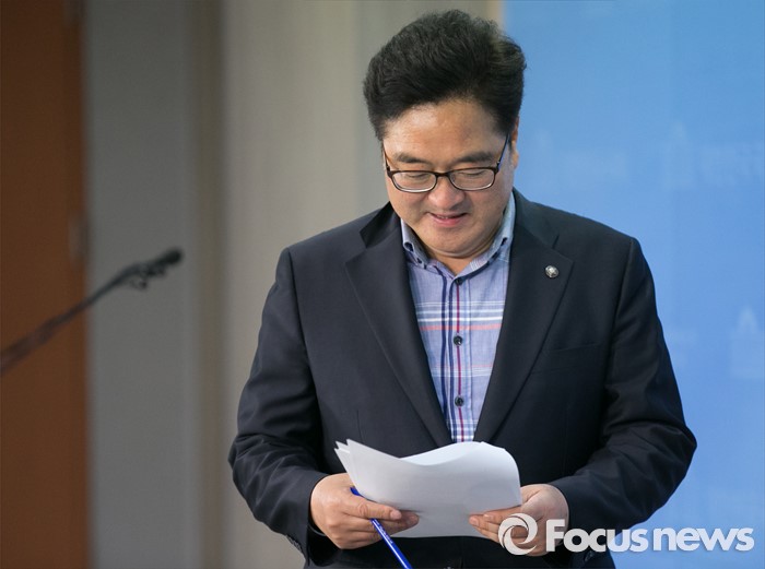 (서울=포커스뉴스) 우원식 더불어민주당 의원이 29일 오후 서울 여의도 국회 정론관에서 원내대표 출마 기자회견을 위해 입장하고 있다.