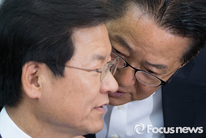 (서울=포커스뉴스) 천정배(왼쪽) 국민의당 공동대표와 박지원 원내대표가 29일 오후 서울 여의도 국회에서 최고위원회의에 참석해 이야기를 나누고 있다.