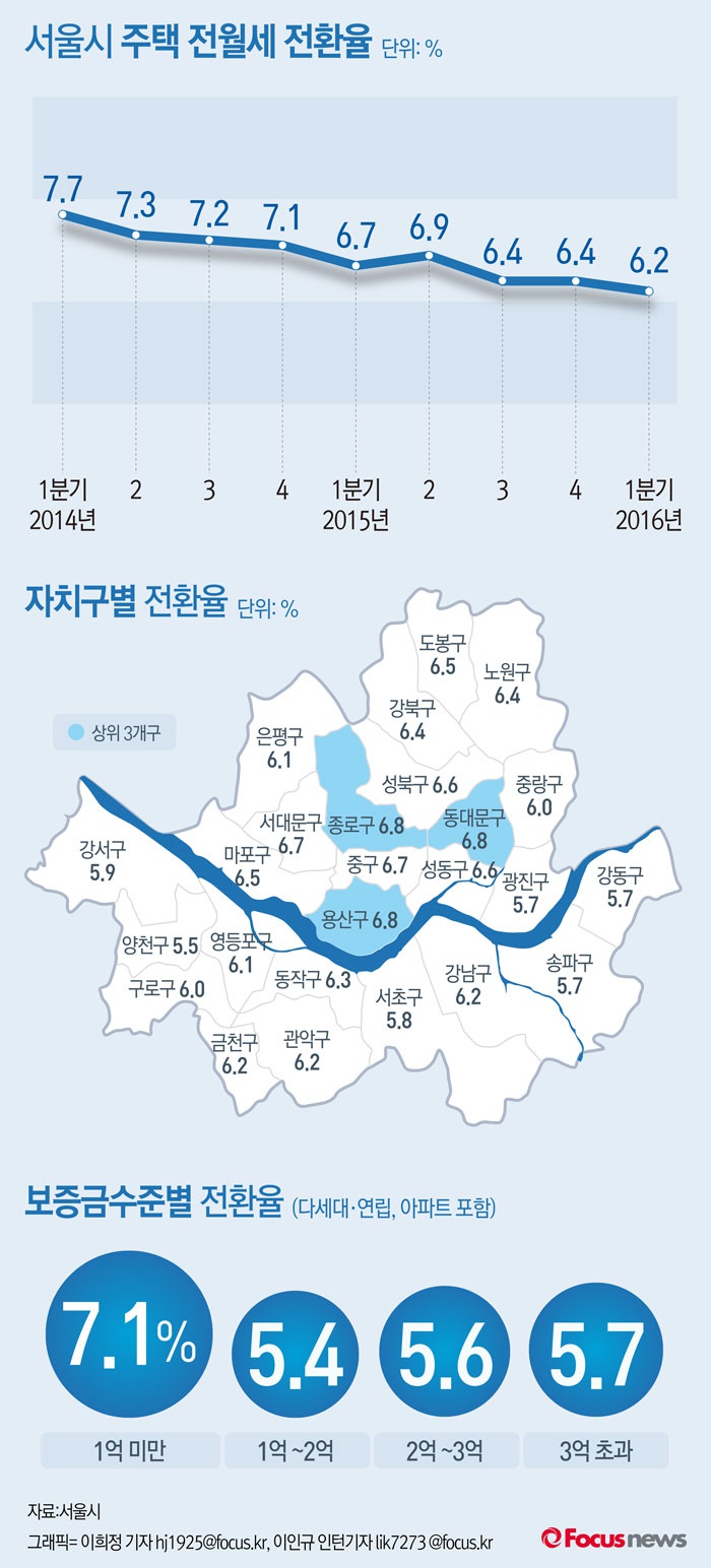 (서울=포커스뉴스) 올해 1분기(1~3월) 서울시내 주택 전월세전환율은 작년말 보다 소폭 하락한 6.2%를 기록했다. 이는 작년 동기간(6.7%)대비 0.5%포인트 하락한 것이다.