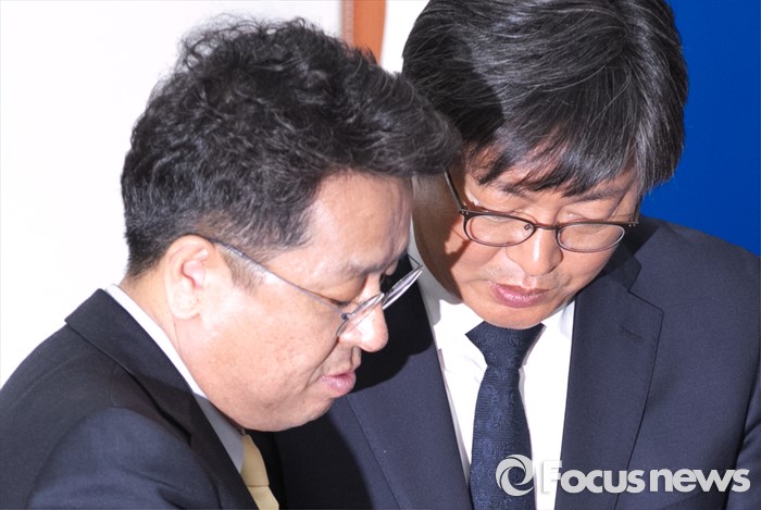(서울=포커스뉴스) 29일 오전 서울 여의도 국회에서 열린 더불어민주당 보수단체 불법자금지원 의혹규명 진상조사 태스크포스(TF) 1차 회의에 참석한 이춘석(오른쪽) 위원장과 이철희 당선인이 대화하고 있다.
